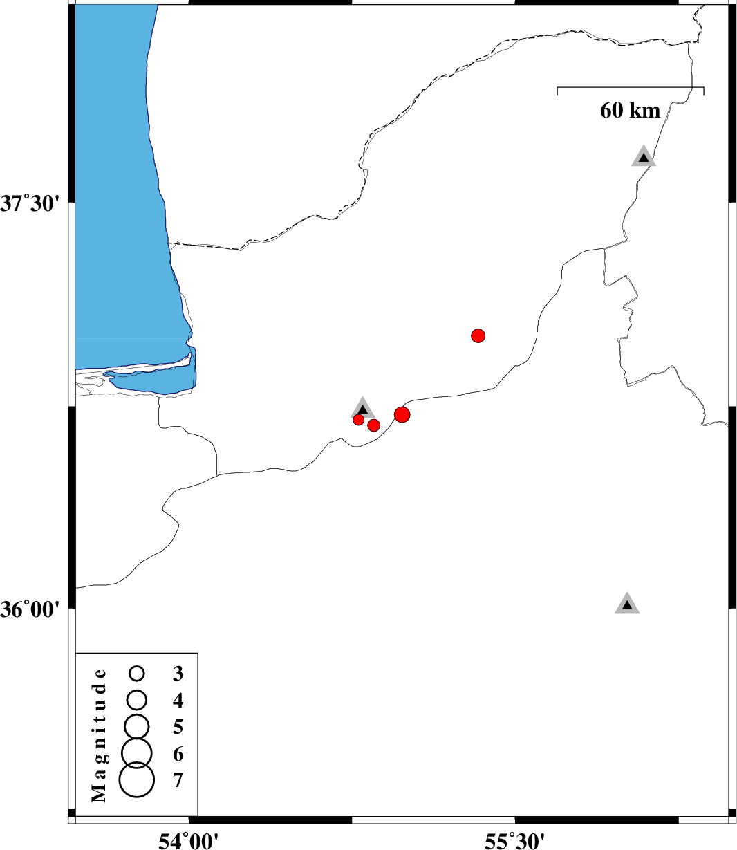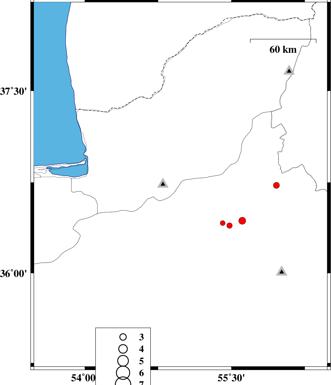| 2010/07/05 | 05:39:56.7 | 10:09:56.7 | 36.7 | 54.78 | 14 | ML:2.3 | Golestan Province, 25 km South of Ali Abad | ||