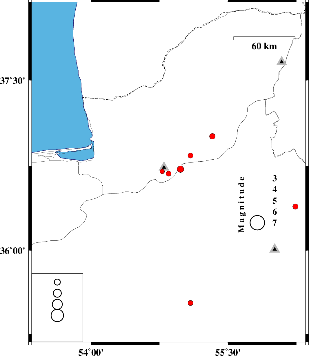 | 2010/06/12 | 15:01:10.1 | 19:31:10.1 | 36.39 | 56.24 | 46 | ML:2.7 | Semnan Province, 64 km South-West of Jajarm |