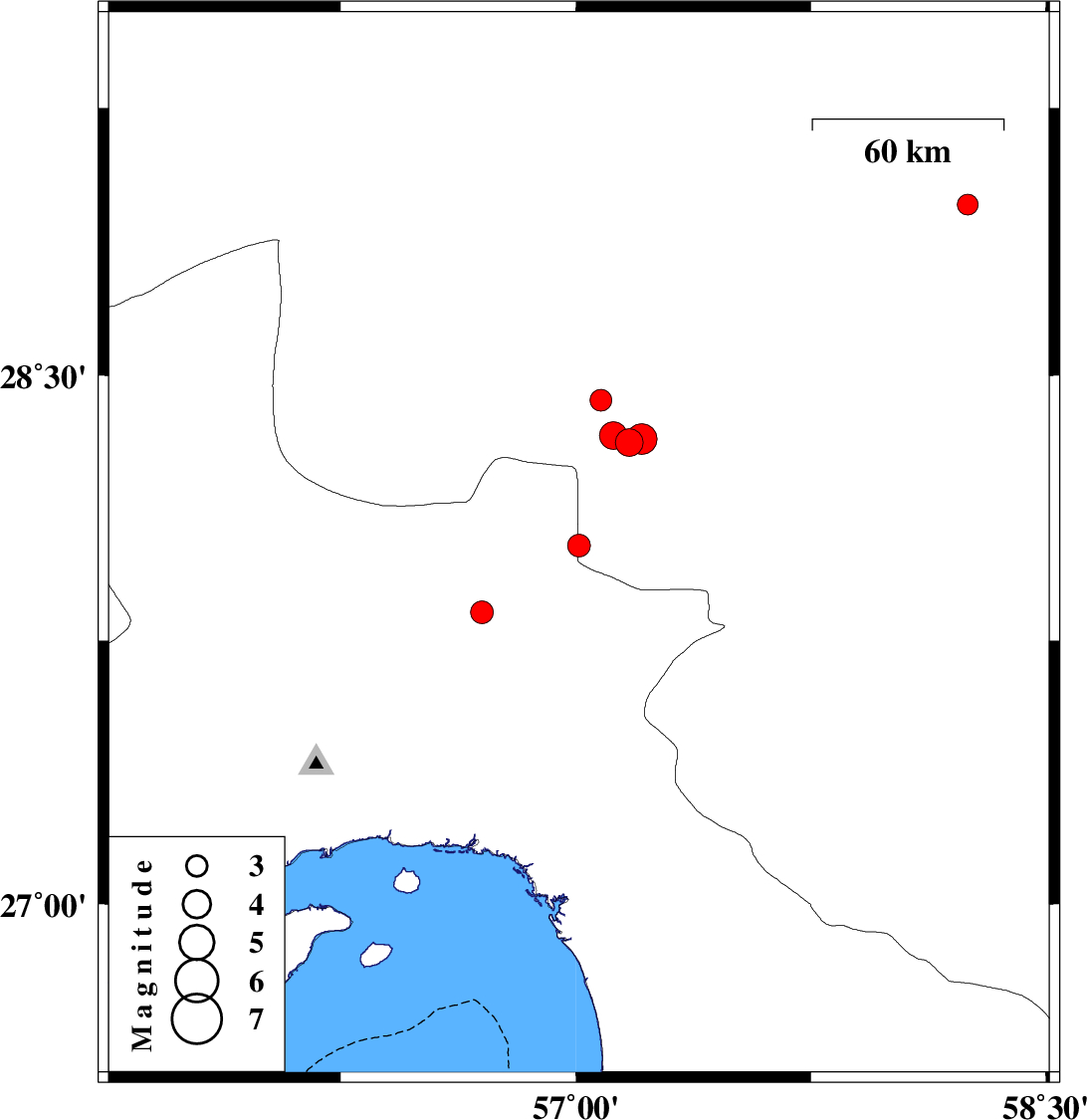 | 2010/06/30 | 04:13:59.7 | 08:43:59.7 | 27.83 | 56.7 | 14 | ML:3.3 | Hormozgan Province, 70 km North-West of Dehbarez | ||
