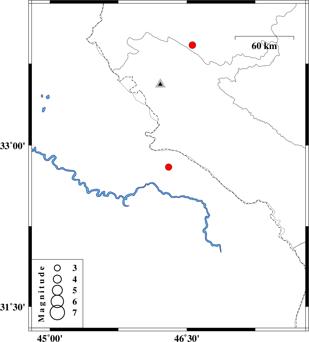 | 2010/07/09 | 14:37:02.9 | 19:07:02.9 | 32.8 | 46.3 | 14 | ML:3.2 | Iraq, 37 km South-East of Mehran | ||