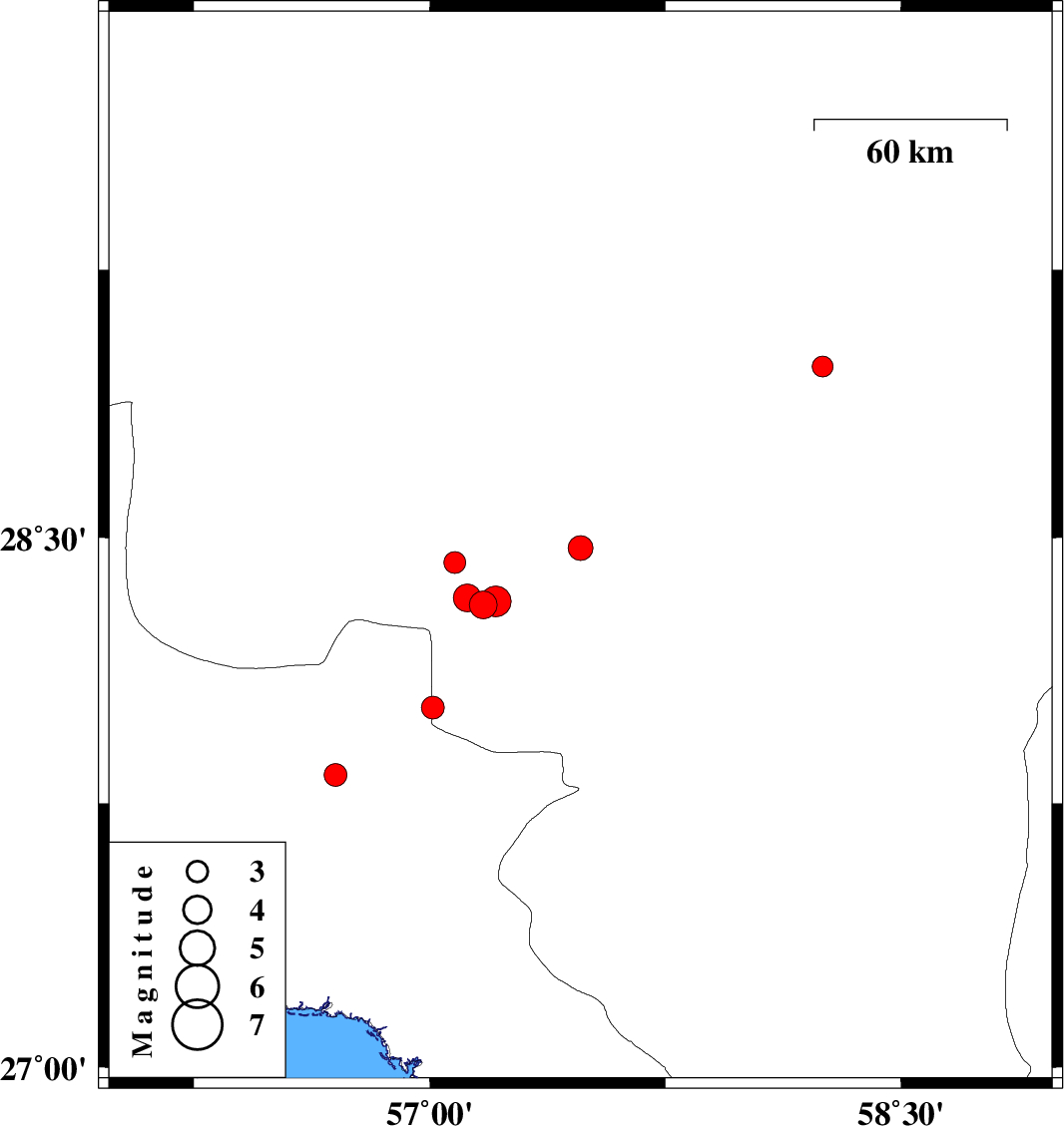 | 2010/06/14 | 04:13:45.8 | 08:43:45.8 | 28.33 | 57.12 | 15 | ML:4 | Kerman Province, 70 km North-West of Kahnuj |