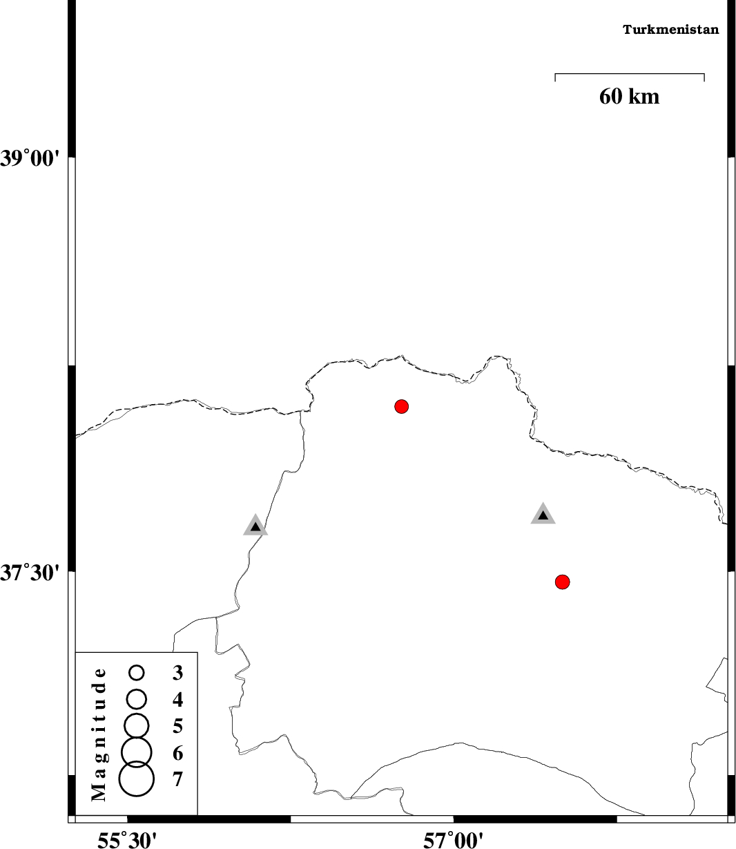 | 2010/07/14 | 03:40:02.2 | 08:10:02.2 | 37.46 | 57.5 | 18 | ML:2.9 | Khorasan(north) Province, 15 km East of Bojnurd | ||