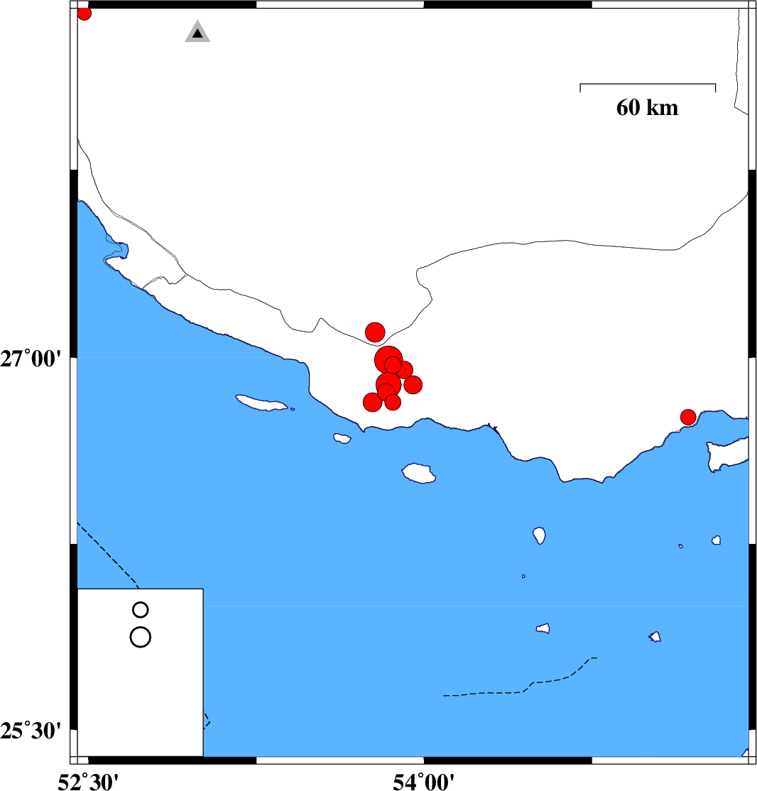 2010/07/20 20:24:52.4 00:54:52.4 26.8953.9518 ML:3.7 Hormozgan Province, 53 km South-West of Bastak