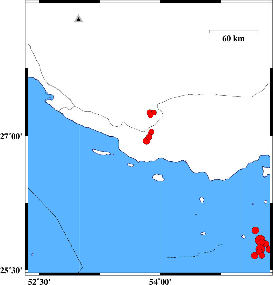 2010/06/24 | 10:16:50.3 | 14:46:50.3 | 26.53 | 54.2 | 18 | ML:3 | Persian Gulf, 65 km West of Bandar-e lengeh | ||