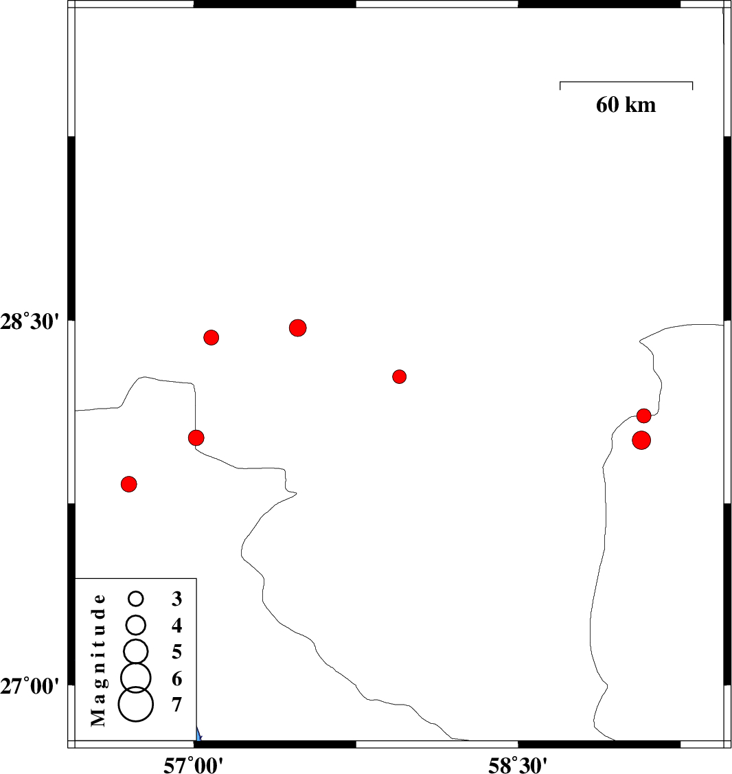 | 2010/06/23 | 15:20:24.3 | 19:50:24.3 | 28.01 | 59.07 | 15 | ML:3.8 | Sistan va Baloochestan Province, 136 km East of Kahnuj |
