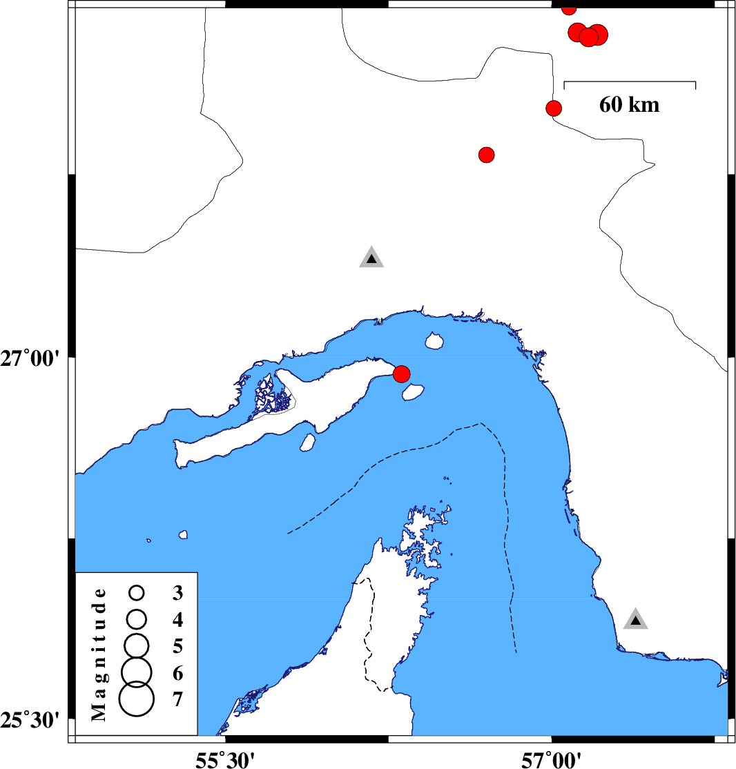 | 2010/06/30 | 04:13:59.7 | 08:43:59.7 | 27.83 | 56.7 | 14 | ML:3.3 | Hormozgan Province, 70 km North-West of Dehbarez | ||