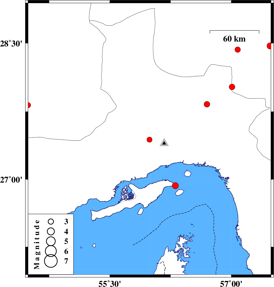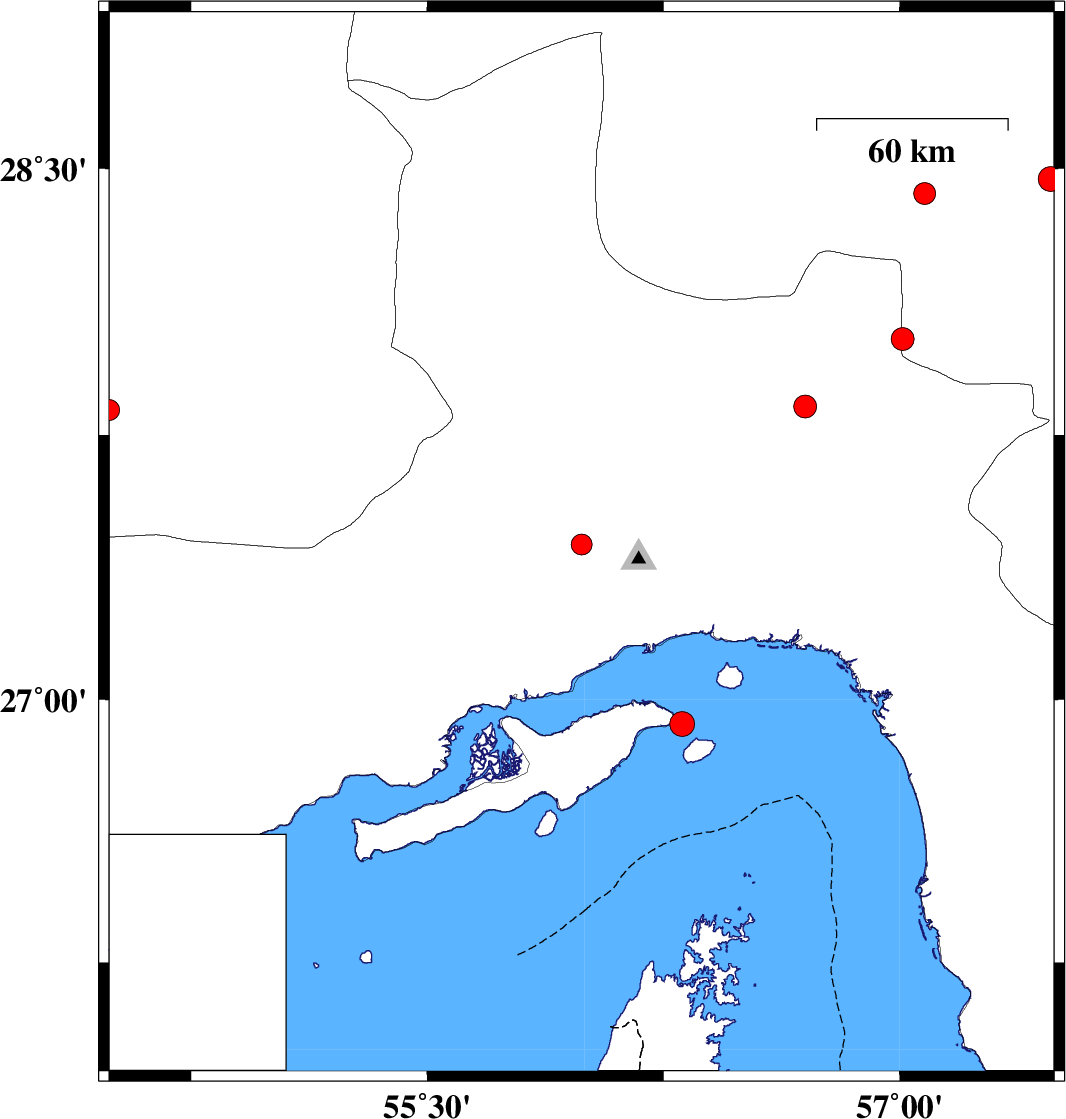 | 2010/06/30 | 04:13:59.7 | 08:43:59.7 | 27.83 | 56.7 | 14 | ML:3.3 | Hormozgan Province, 70 km North-West of Dehbarez | ||