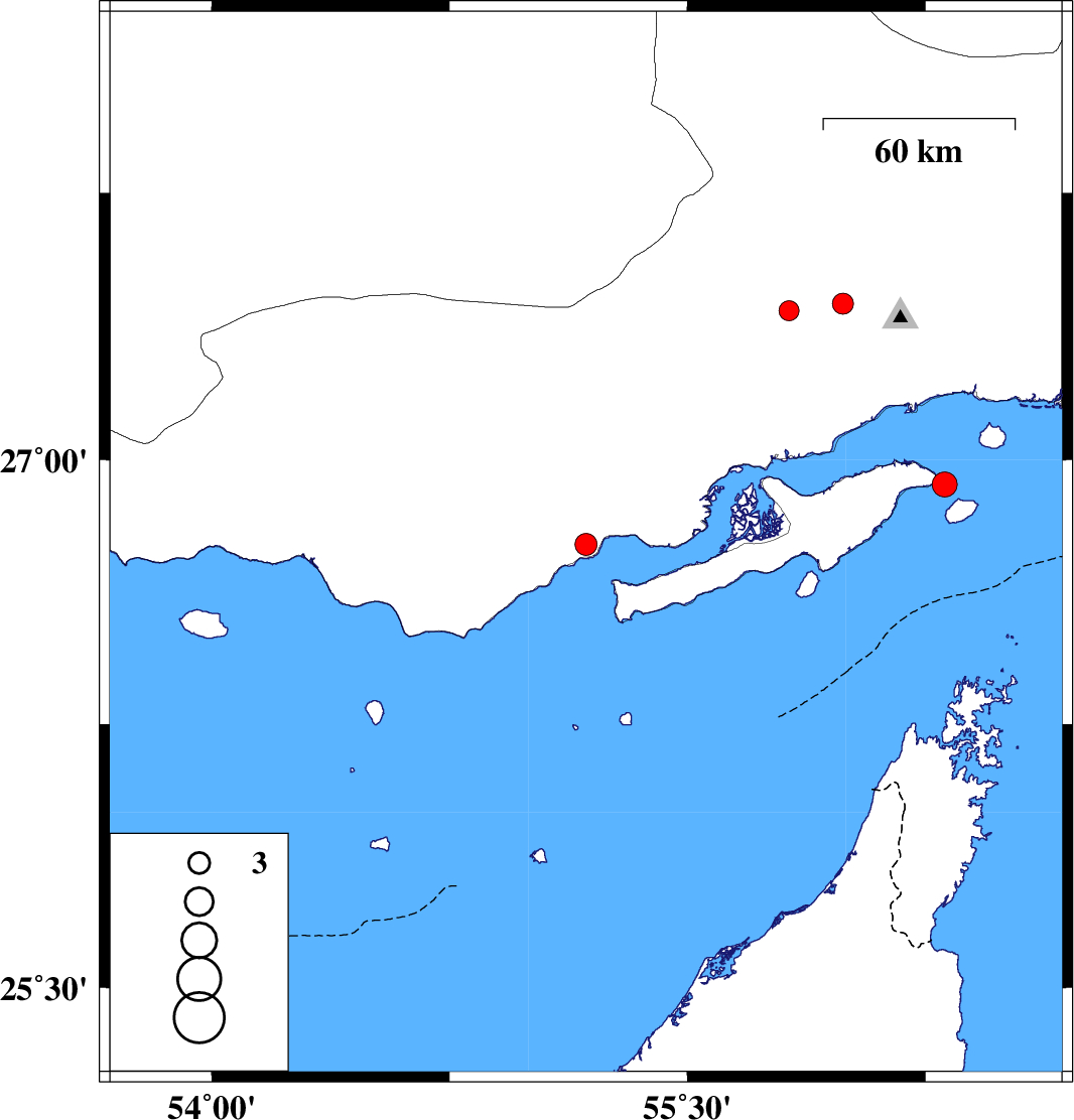 | 2010/07/14 | 14:12:49.4 | 18:42:49.4 | 26.93 | 56.31 | 8 | ML:3.5 | Persian Gulf, 5 km Qeshm |
