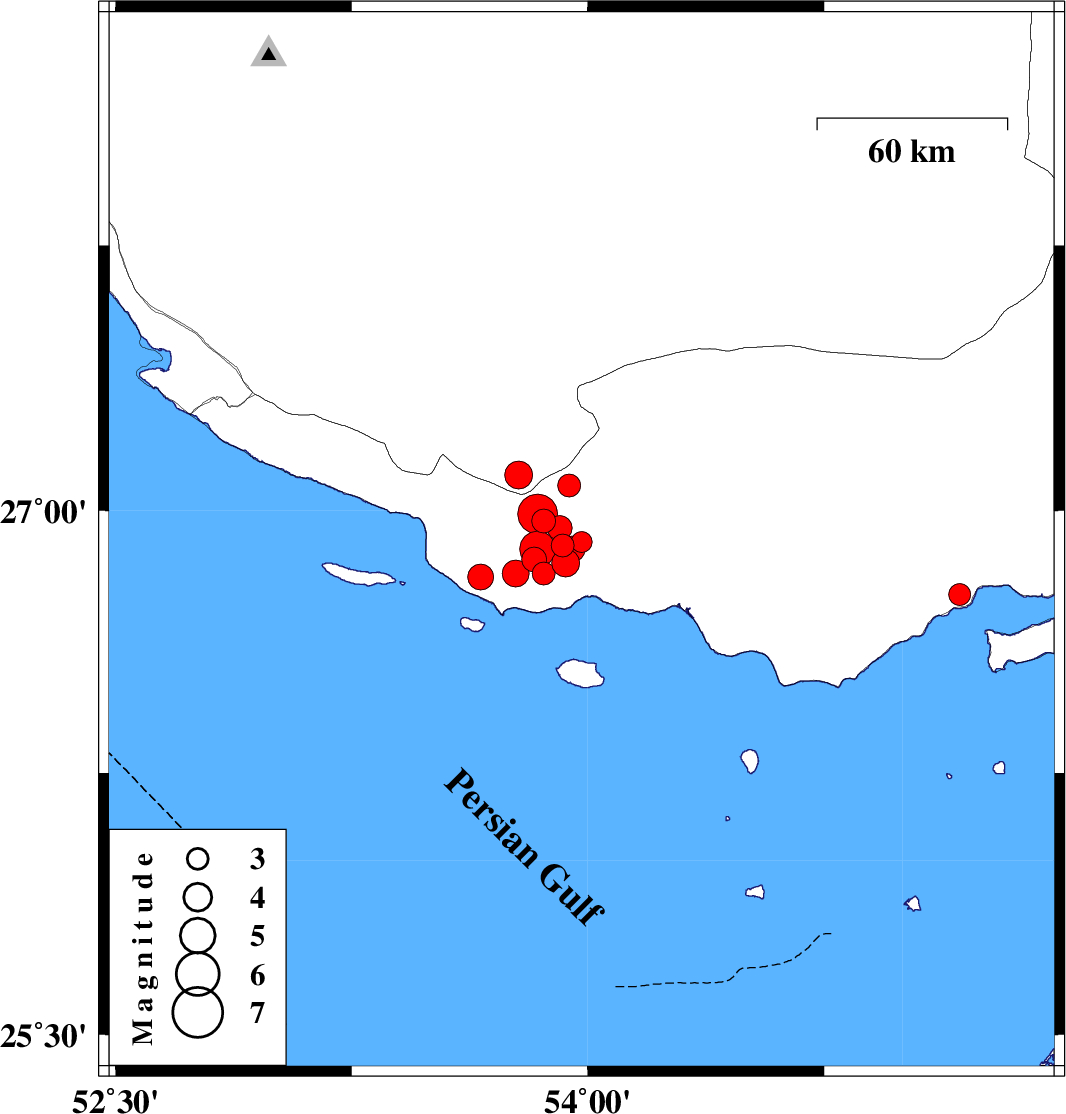 2010/07/21 | 11:14:28.9 | 15:44:28.9 | 26.91 | 53.98 | 14 | ML:3 | Hormozgan Province, 50 km South-West of Bastak | ||