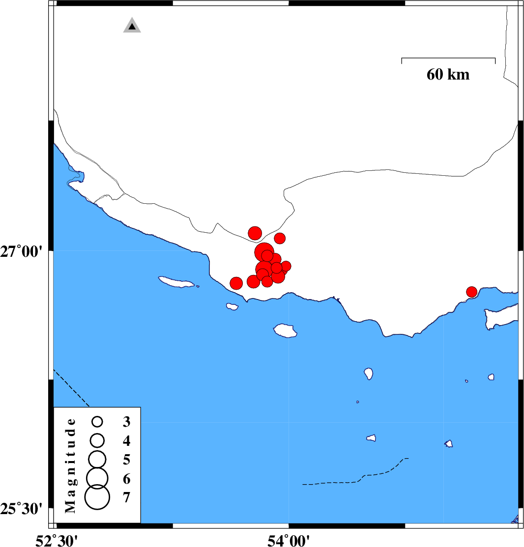 2010/07/20 20:24:52.4 00:54:52.4 26.8953.9518 ML:3.7 Hormozgan Province, 53 km South-West of Bastak