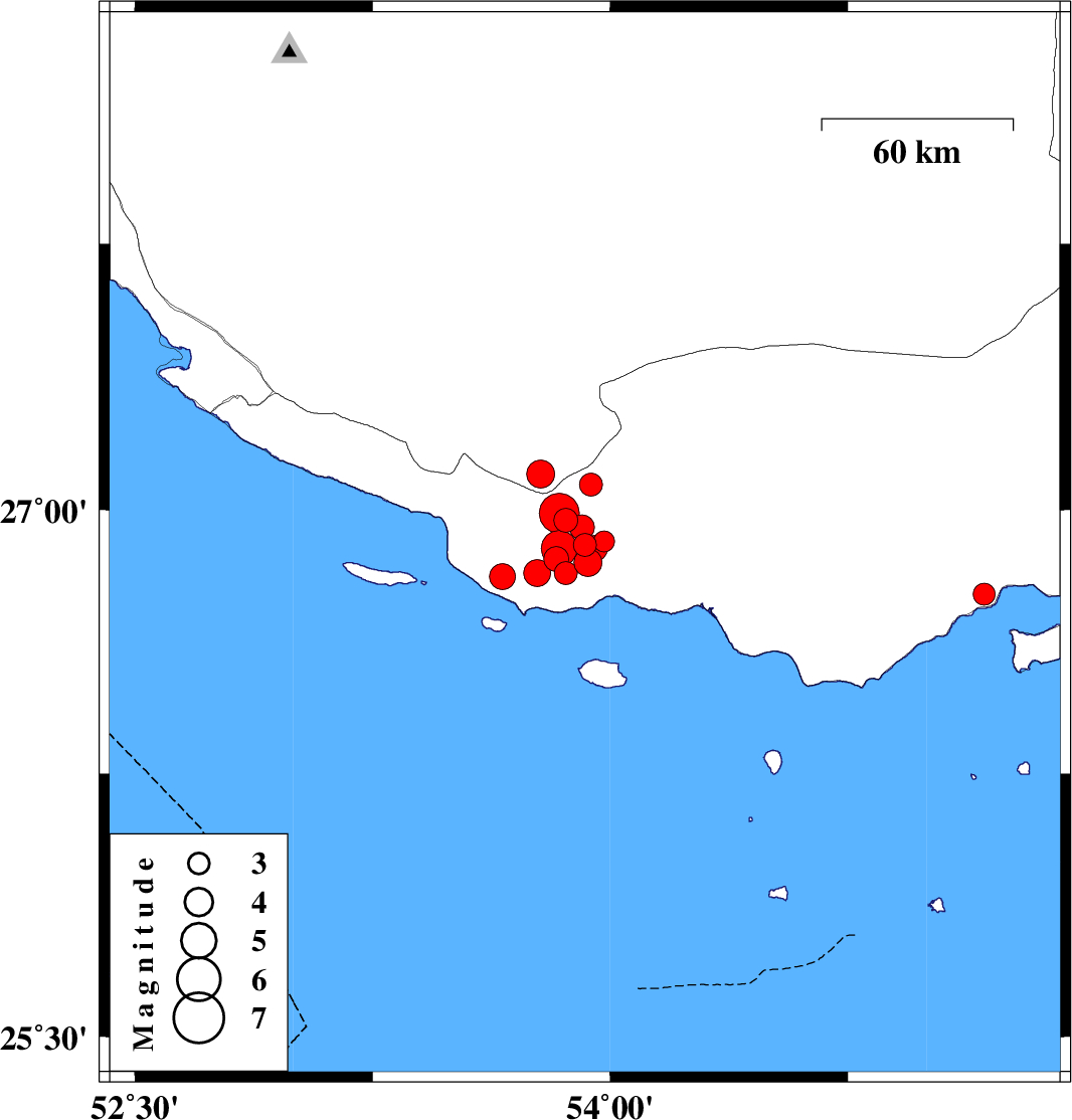 2010/07/20 20:24:52.4 00:54:52.4 26.8953.9518 ML:3.7 Hormozgan Province, 53 km South-West of Bastak