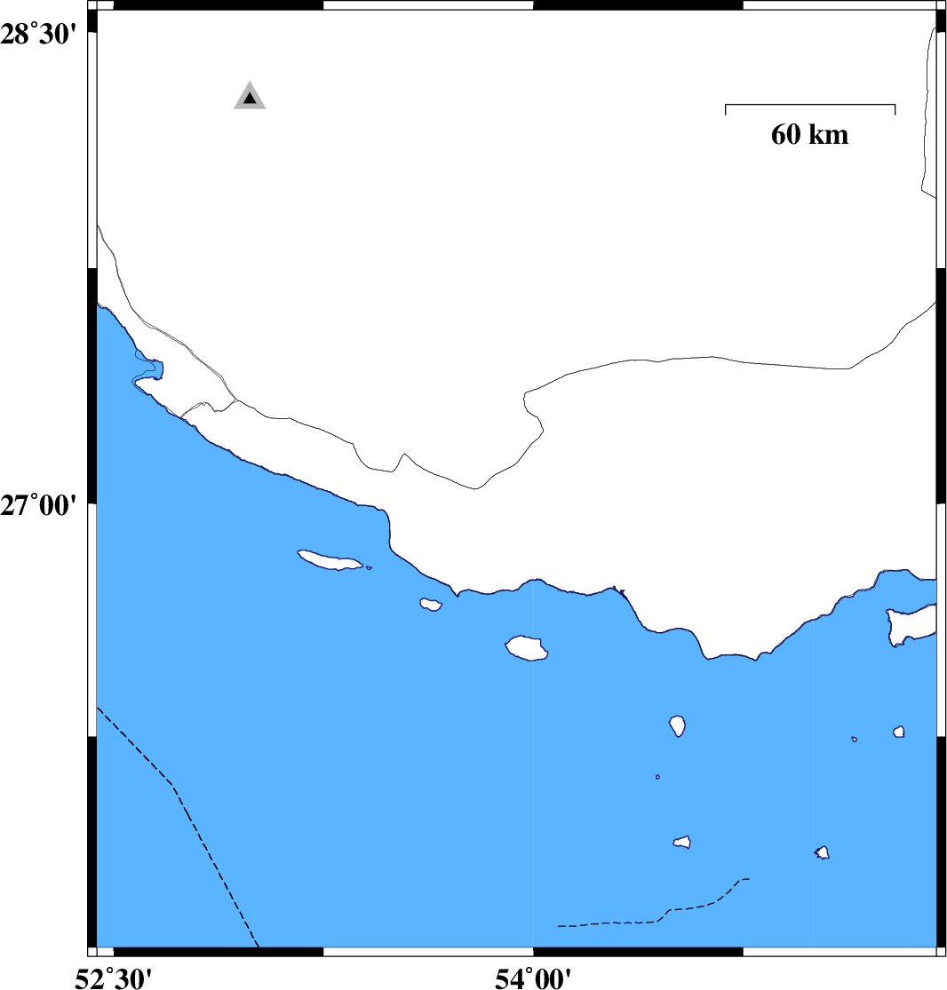 2010/07/21 | 19:28:35.2 | 23:58:35.2 | 27.07 | 53.94 | 14 | ML:3.3 | Hormozgan Province, 44 km South-West of Bastak | ||