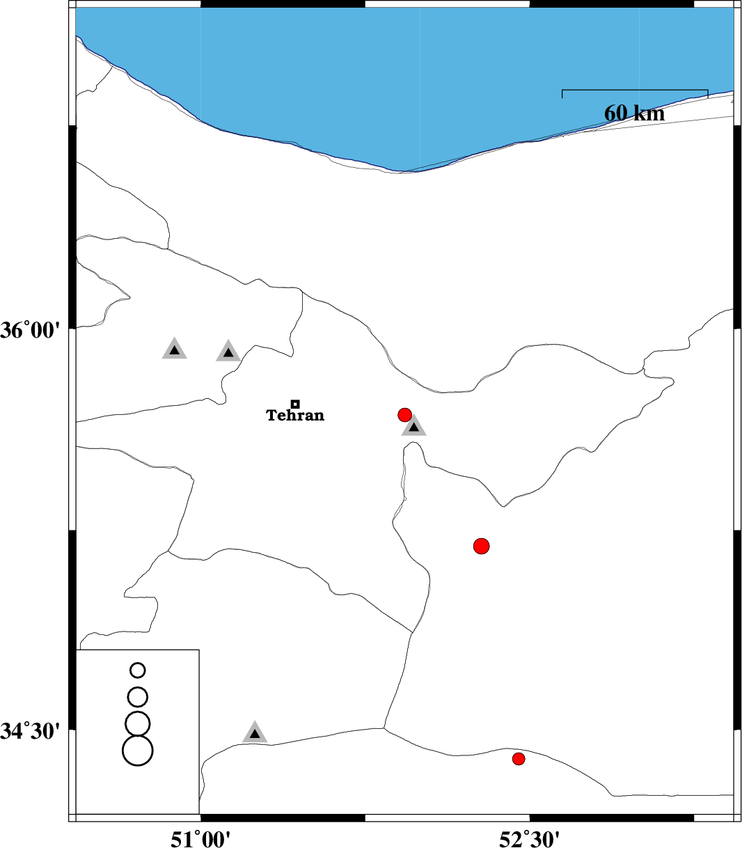 | 2010/07/22 | 00:51:20.8 | 05:21:20.8 | 35.68 | 51.93 | 14 | ML:2.8 | Tehran Province, 13 km West of Damavand | ||
