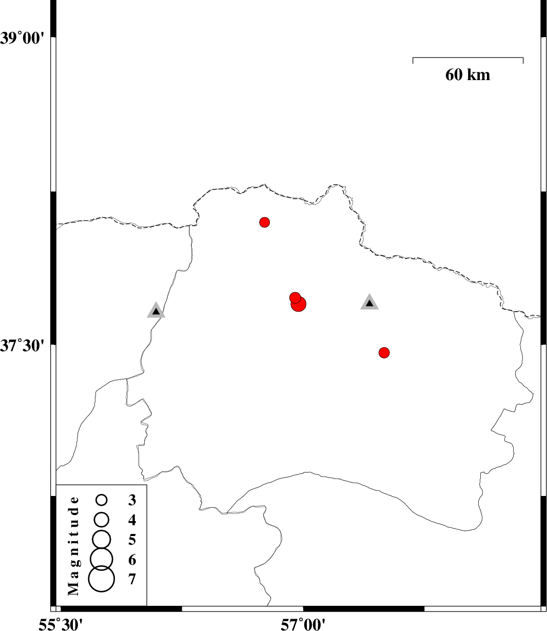 | 2010/07/23 | 00:56:40.9 | 05:26:40.9 | 37.7 | 56.97 | 9 | ML:4.2 | Khorasan(north) Province, 17 km North of Ashkhaneh | ||