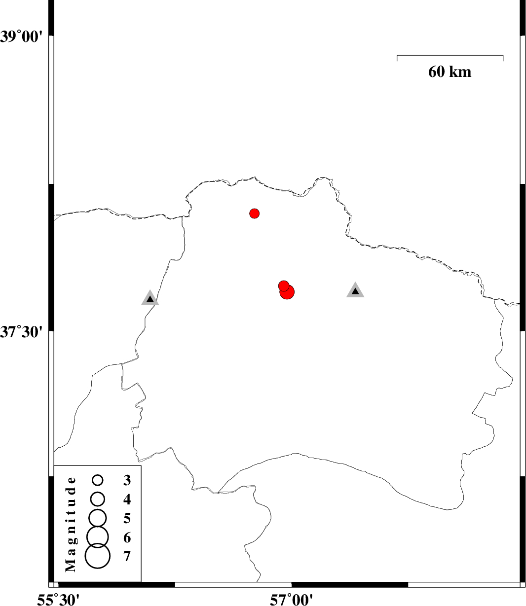 | 2010/07/20 | 15:54:12.4 | 20:24:12.4 | 38.1 | 56.76 | 14 | ML:2.8 | Khorasan(north) Province, 64 km North-West of Ashkhaneh |
