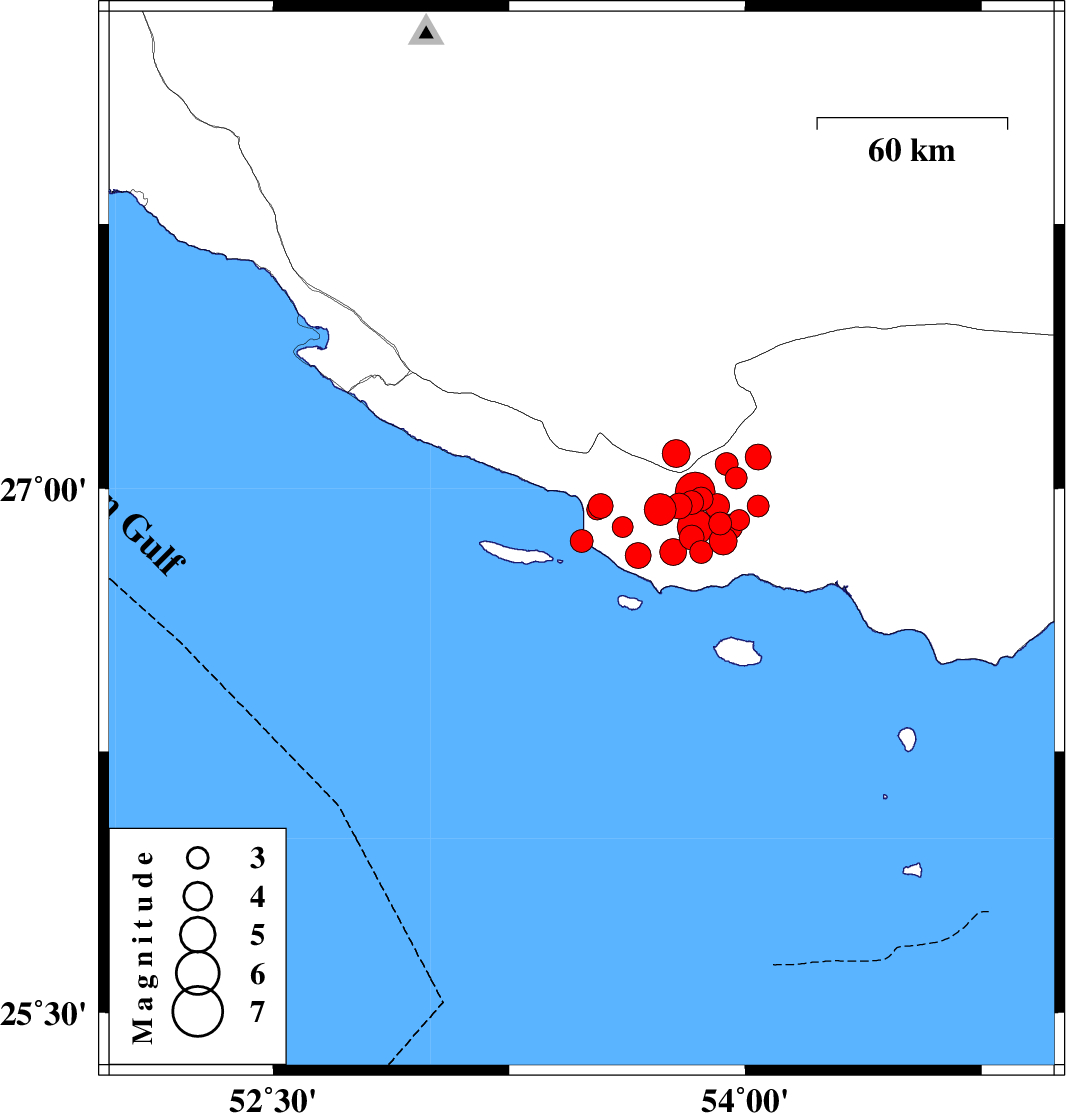 2010/07/20 20:24:52.4 00:54:52.4 26.8953.9518 ML:3.7 Hormozgan Province, 53 km South-West of Bastak