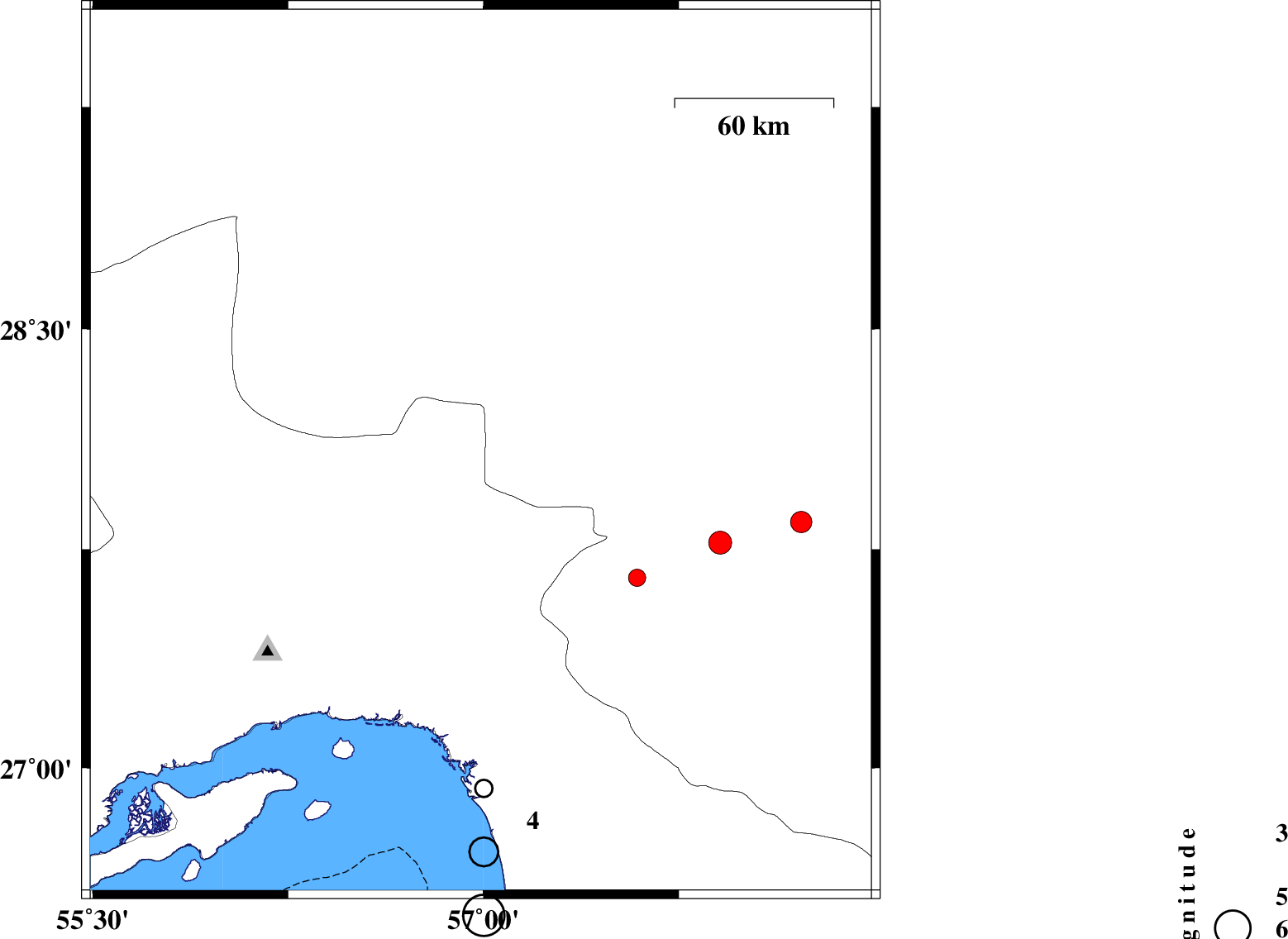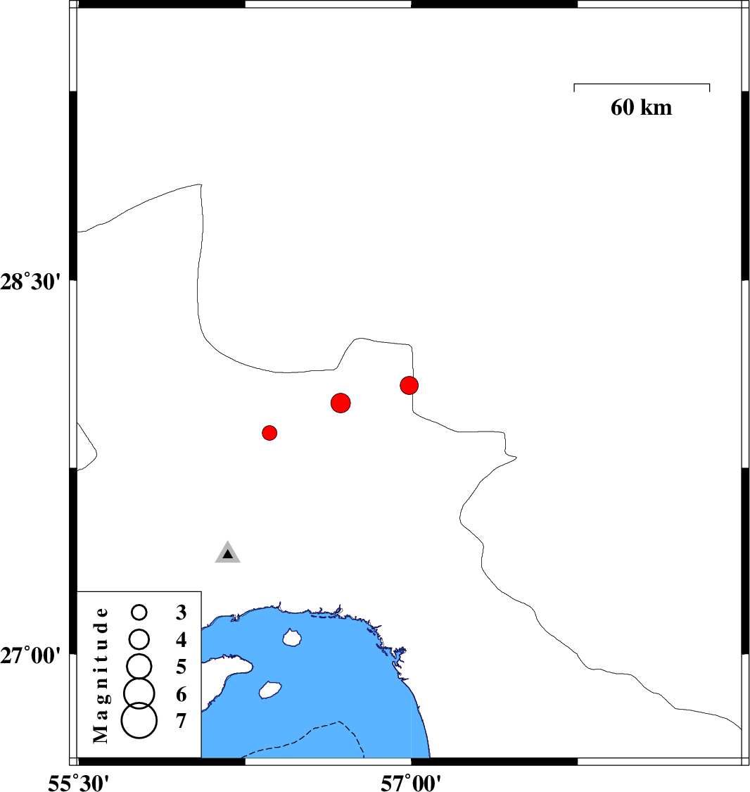 | 2010/07/27 | 18:43:53.1 | 23:13:53.1 | 28.08 | 56.99 | 15 | ML:3.6 | Hormozgan Province, 70 km North-West of Kahnuj | ||