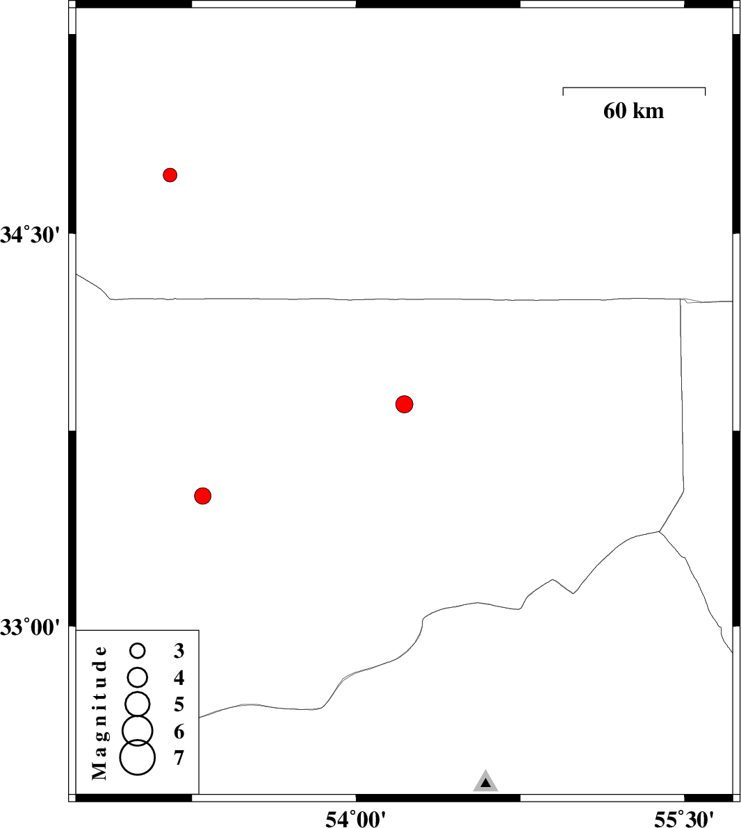 | 2010/07/25 | 05:37:52.6 | 10:07:52.6 | 33.5 | 53.3 | 14 | ML:3.4 | Esfahan Province, 73 km North-East of Nain |