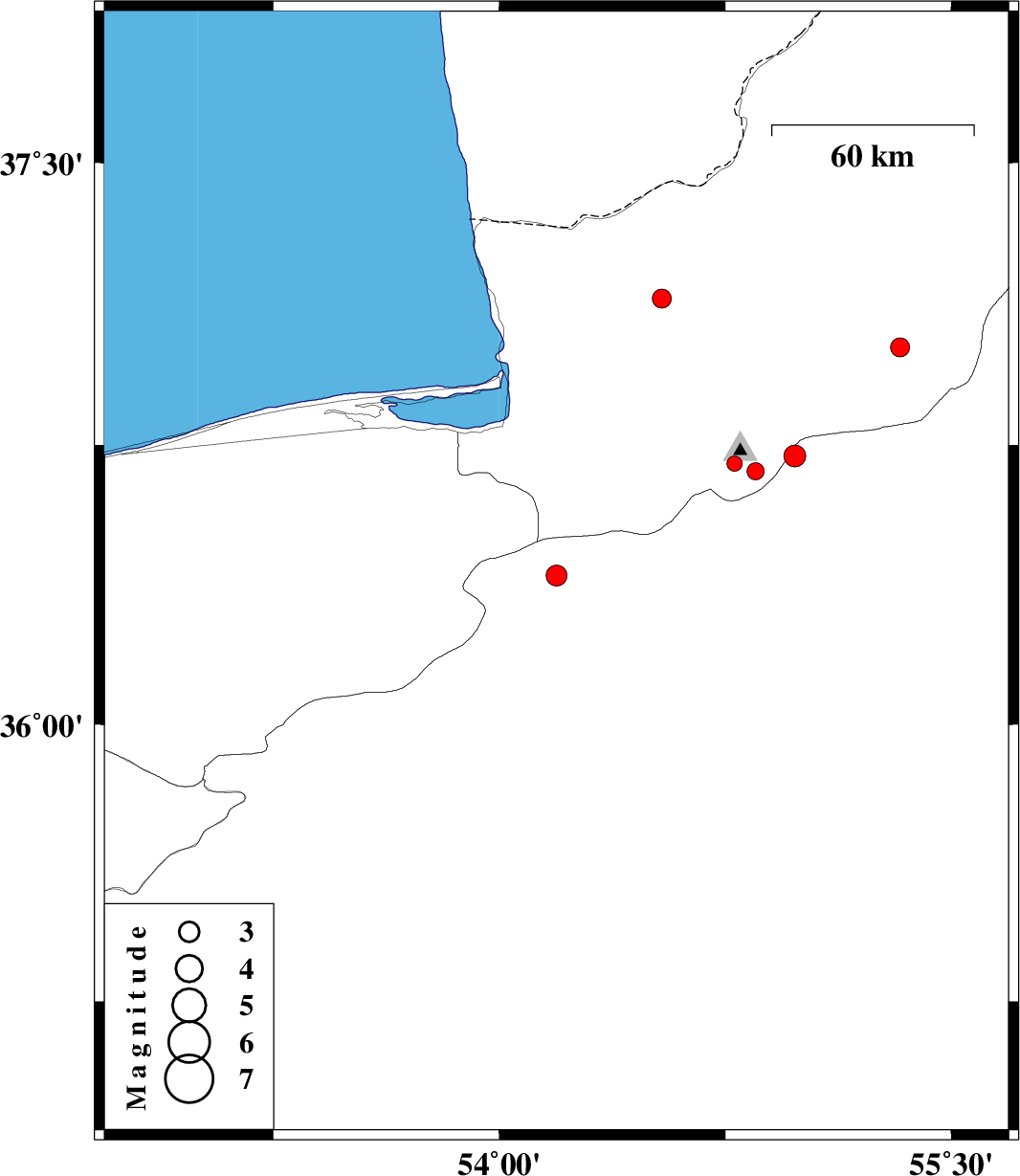 | 2010/07/29 | 04:16:26.9 | 08:46:26.9 | 37.14 | 54.54 | 15 | ML:2.8 | Golestan Province, 16 km North of Aq Qaleh | ||