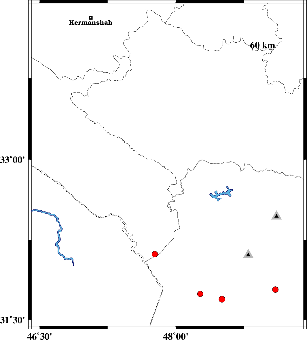 | 2010/07/30 | 17:16:24.8 | 21:46:24.8 | 32.94 | 47.91 | 46 | ML:2.9 | Lorestan Province, 30 km South-East of Pol-e dokhtar | ||