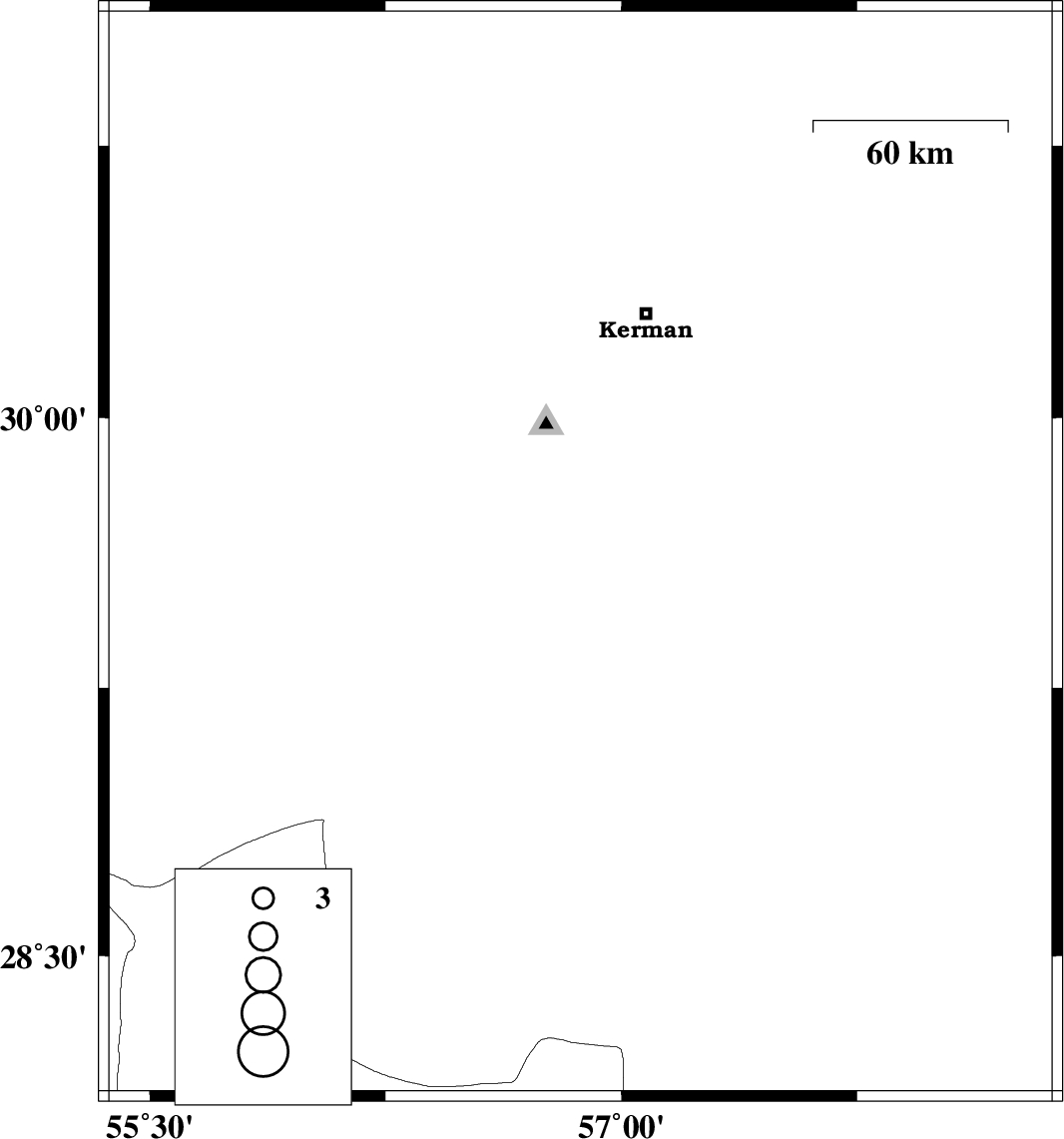 | 2010/07/31 | 09:34:19.3 | 14:04:19.3 | 29.72 | 56.43 | 15 | ML:3 | Kerman Province, 26 km South-West of Bardsir | ||