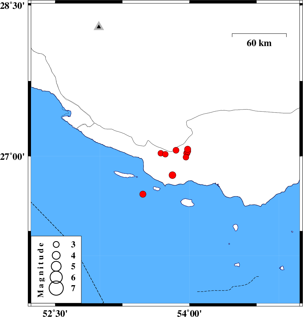 | 2010/07/28 | 11:58:20.7 | 16:28:20.7 | 27.06 | 53.85 | 14 | ML:3.1 | Hormozgan Province, 53 km South-West of Bastak | ||