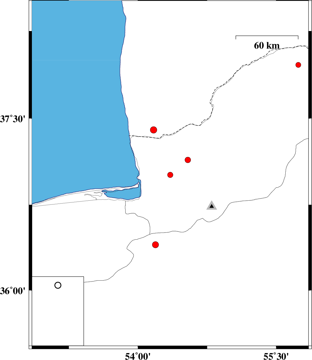 | 2010/07/29 | 04:16:26.9 | 08:46:26.9 | 37.14 | 54.54 | 15 | ML:2.8 | Golestan Province, 16 km North of Aq Qaleh | ||