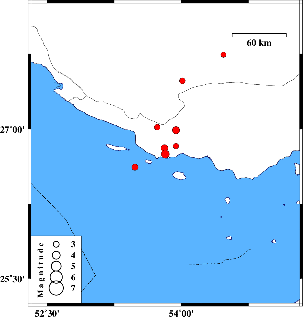 | 2010/08/02 | 05:38:36.0 | 10:08:36.0 | 26.62 | 53.48 | 46 | ML:3.2 | Persian Gulf, 86 km South-East of Lamerd | ||