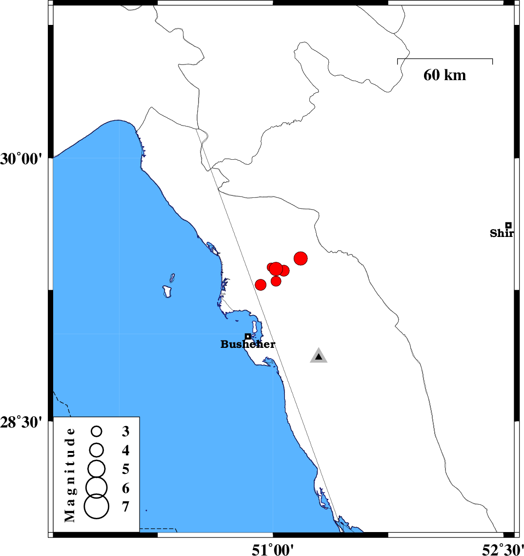| 2010/08/06 | 19:24:56.5 | 23:54:56.5 | 29.3 | 51.02 | 34 | ML:3 | Bushehr Province, 18 km West of Borazjan | ||