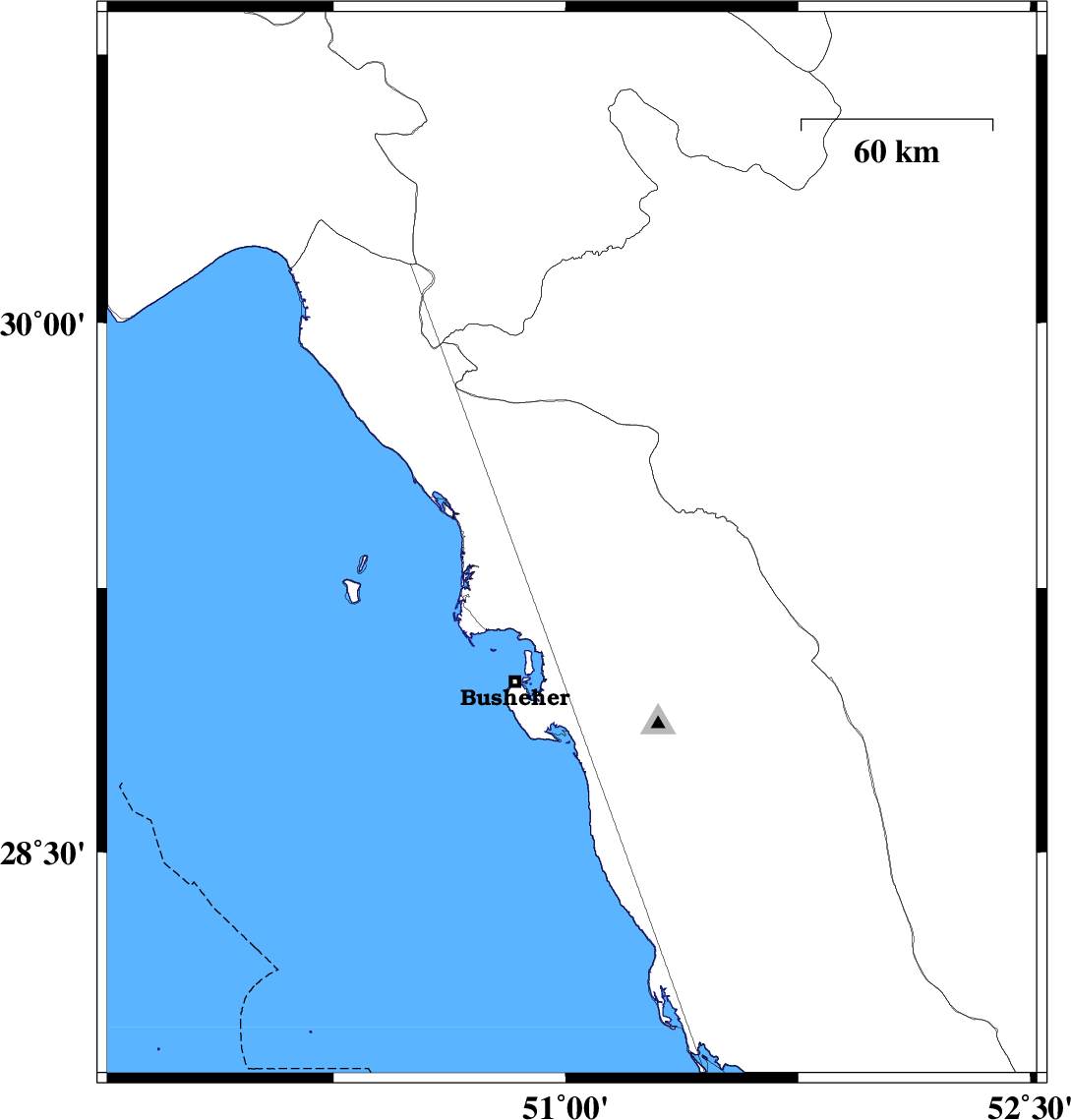 | 2010/08/06 | 19:24:56.5 | 23:54:56.5 | 29.3 | 51.02 | 34 | ML:3 | Bushehr Province, 18 km West of Borazjan | ||