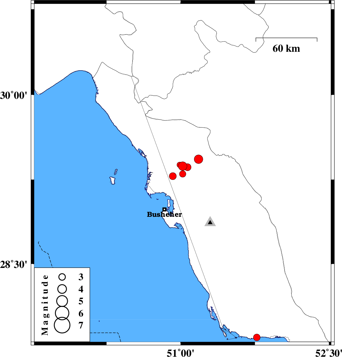 | 2010/08/06 | 19:15:47.3 | 23:45:47.3 | 29.37 | 51.02 | 20 | ML:3.9 | Bushehr Province, 21 km North-West of Borazjan | ||