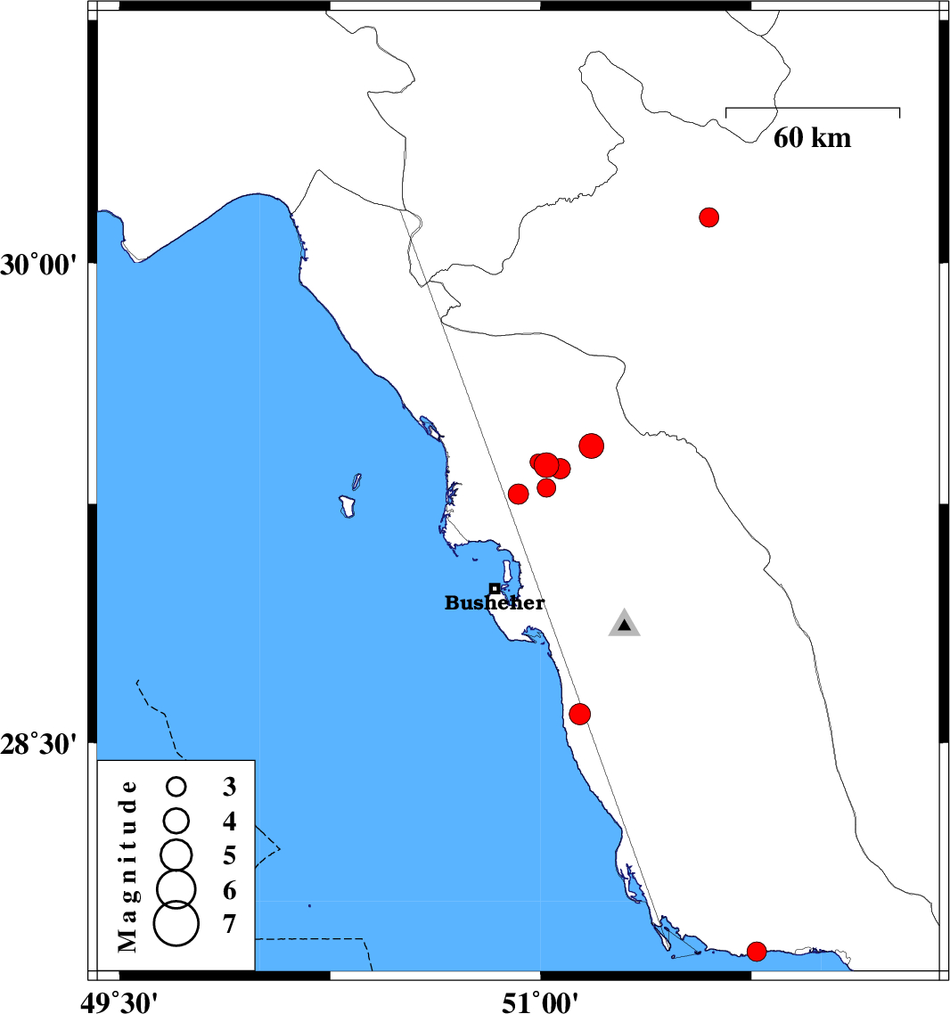 | 2010/08/06 | 19:24:56.5 | 23:54:56.5 | 29.3 | 51.02 | 34 | ML:3 | Bushehr Province, 18 km West of Borazjan | ||