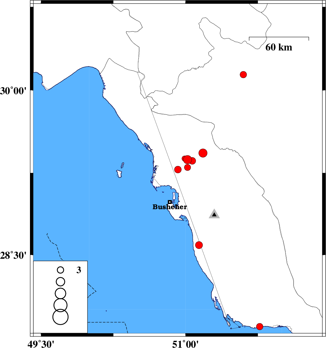 2010/08/06 | 19:24:56.5 | 23:54:56.5 | 29.3 | 51.02 | 34 | ML:3 | Bushehr Province, 18 km West of Borazjan | ||