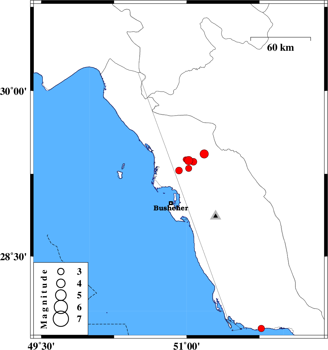 | 2010/08/06 | 19:24:56.5 | 23:54:56.5 | 29.3 | 51.02 | 34 | ML:3 | Bushehr Province, 18 km West of Borazjan | ||