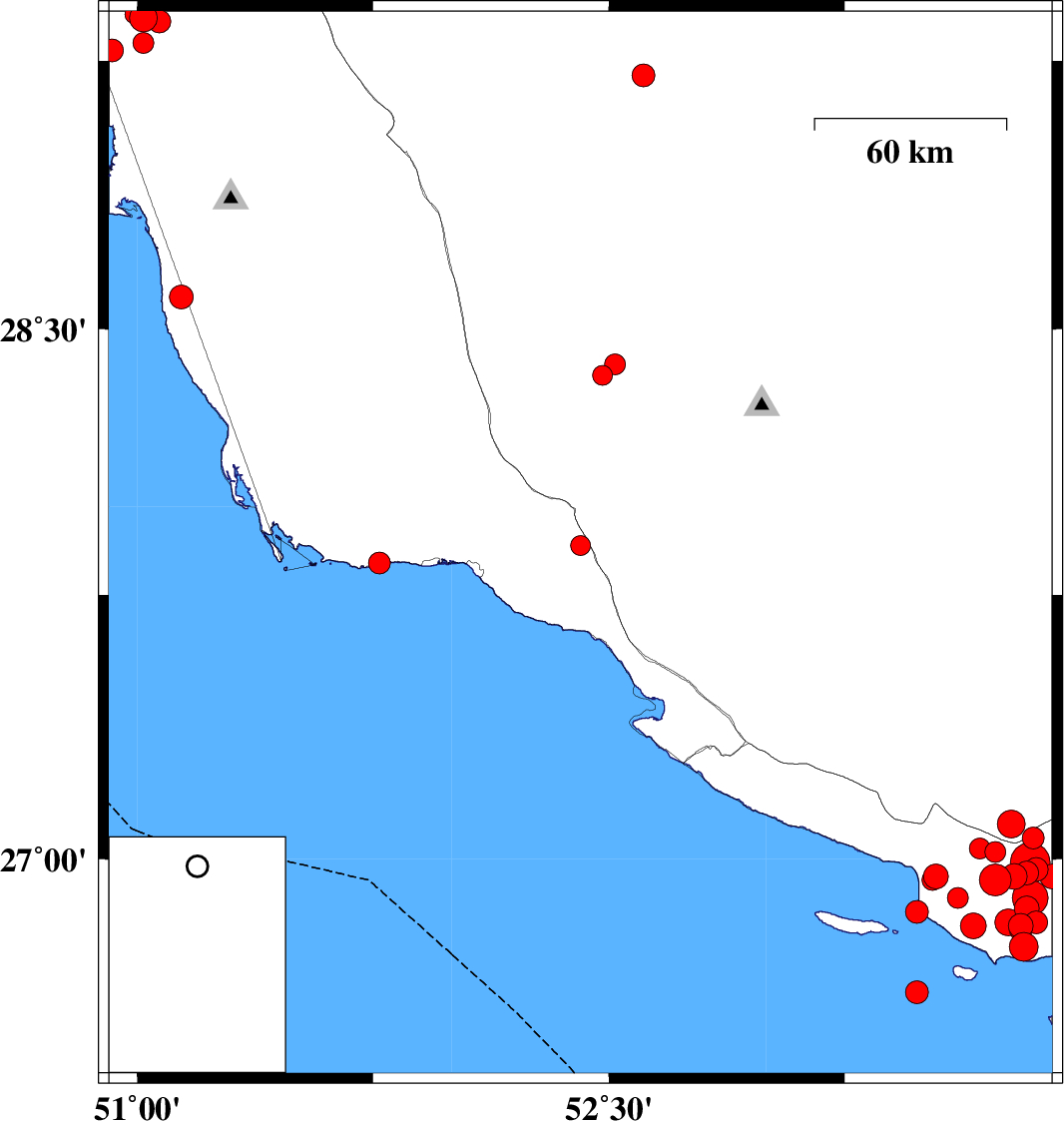 2010/08/06 | 06:57:11.3 | 11:27:11.3 | 27.84 | 51.77 | 14 | ML:3.1 | Bushehr Province, 29 km West of Bandar-e kangan | ||