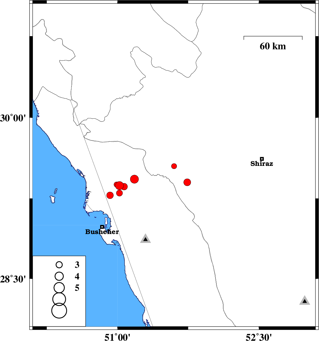 | 2010/08/06 | 19:15:47.3 | 23:45:47.3 | 29.37 | 51.02 | 20 | ML:3.9 | Bushehr Province, 21 km North-West of Borazjan | ||