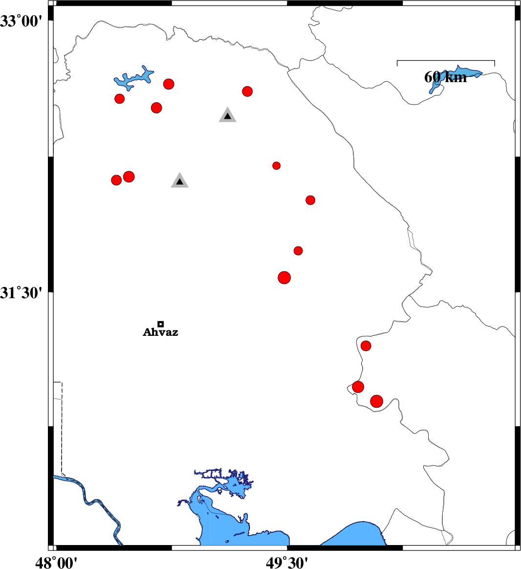 2010/07/30 | 02:36:27.7 | 07:06:27.7 | 32.14 | 48.47 | 15 | ML:3.3 | Khoozestan Province, 22 km East of Shush | ||