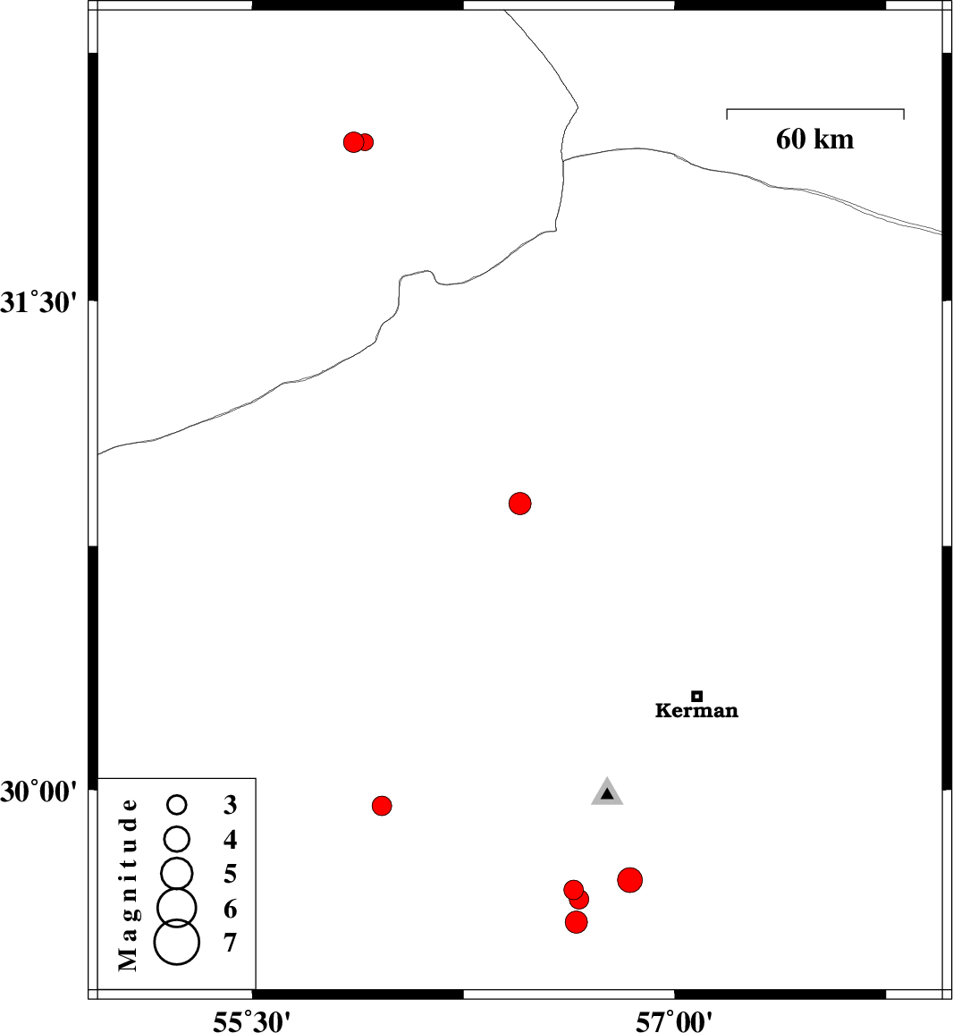 | 2010/08/09 | 04:15:21.7 | 08:45:21.7 | 29.69 | 56.64 | 15 | ML:3.1 | Kerman Province, 27 km South of Bardsir | ||