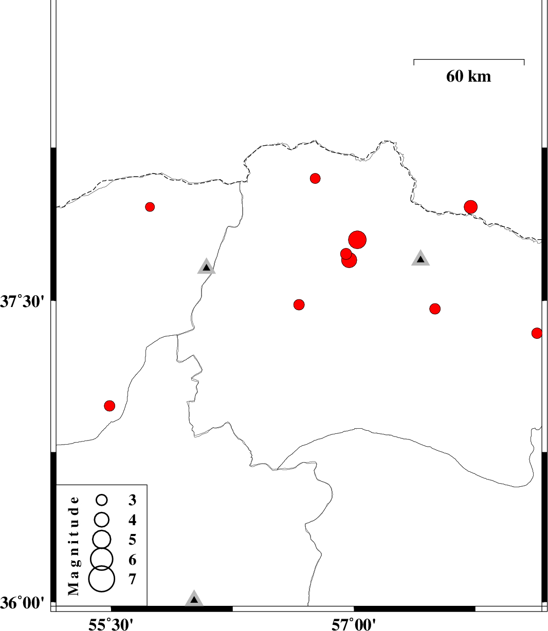 | 2010/08/11 | 06:45:19.2 | 11:15:19.2 | 37.48 | 56.66 | 15 | ML:2.9 | Khorasan(north) Province, 26 km West of Ashkhaneh | ||