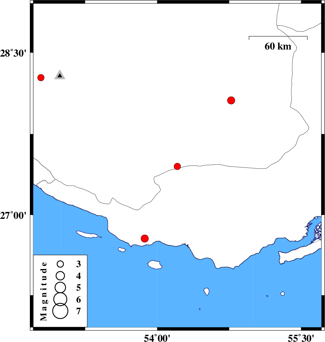 | 2010/08/07 | 03:34:12.8 | 08:04:12.8 | 28.06 | 54.77 | 14 | ML:3.5 | Fars Province, 60 km North-East of Lar |