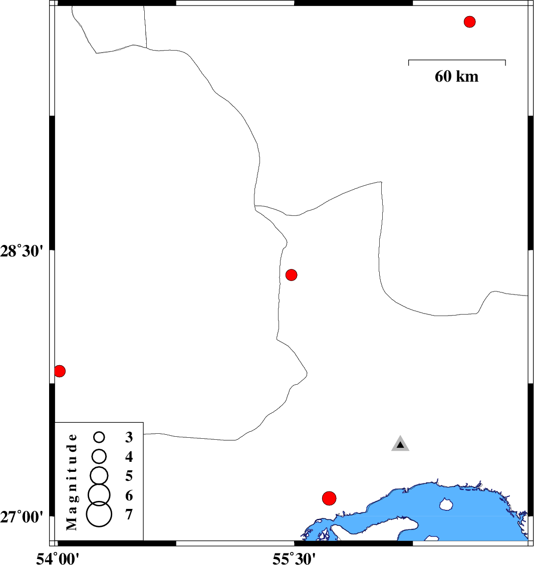 | 2010/08/11 | 09:06:45.6 | 13:36:45.6 | 27.1 | 55.72 | 10 | ML:3.9 | Hormozgan Province, 56 km West of Bandar-e abbas |