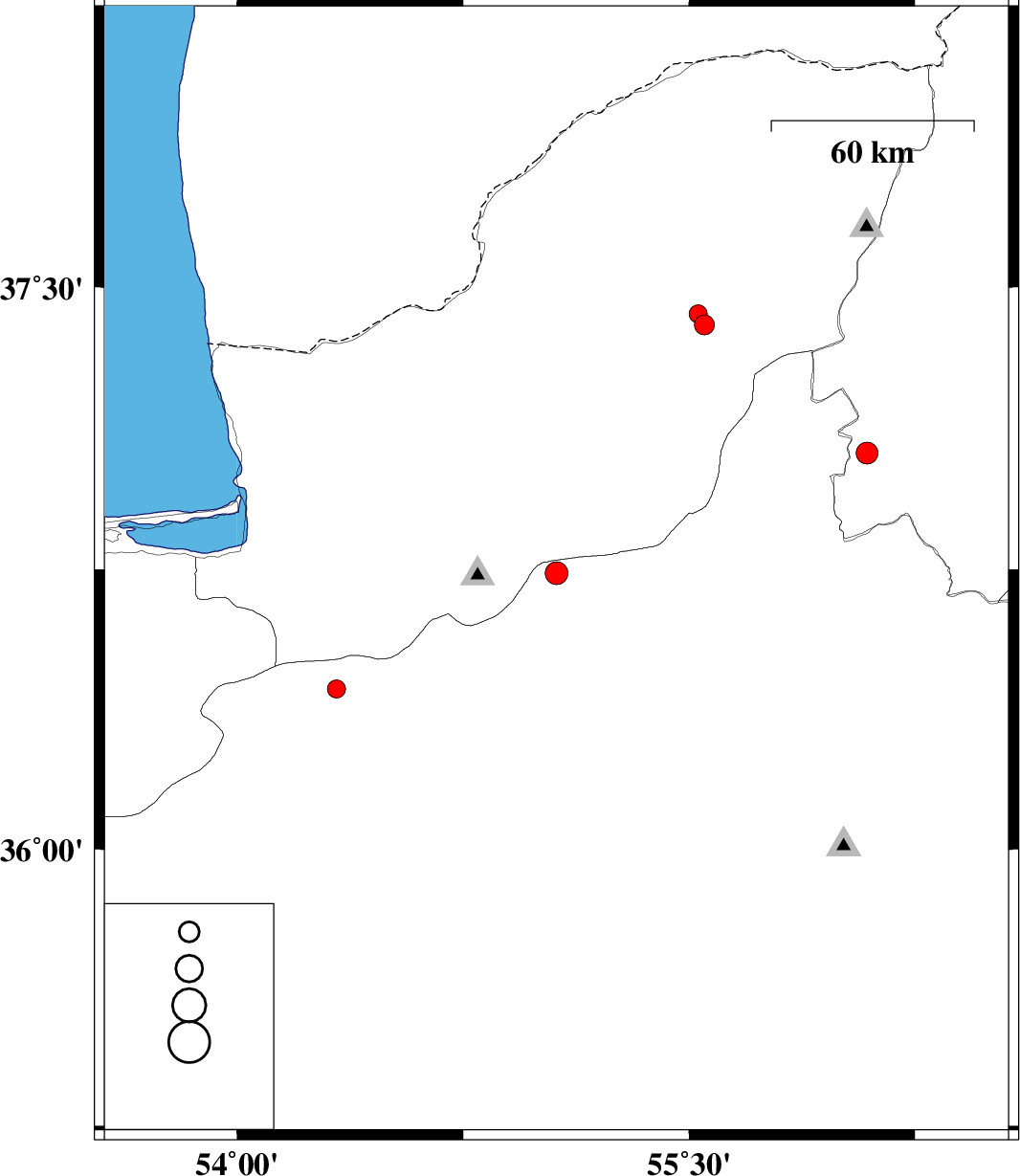 | 2010/08/21 | 00:17:06.1 | 04:47:06.1 | 37.43 | 55.53 | 15 | ML:2.7 | Golestan Province, 6 km Kalaleh | ||