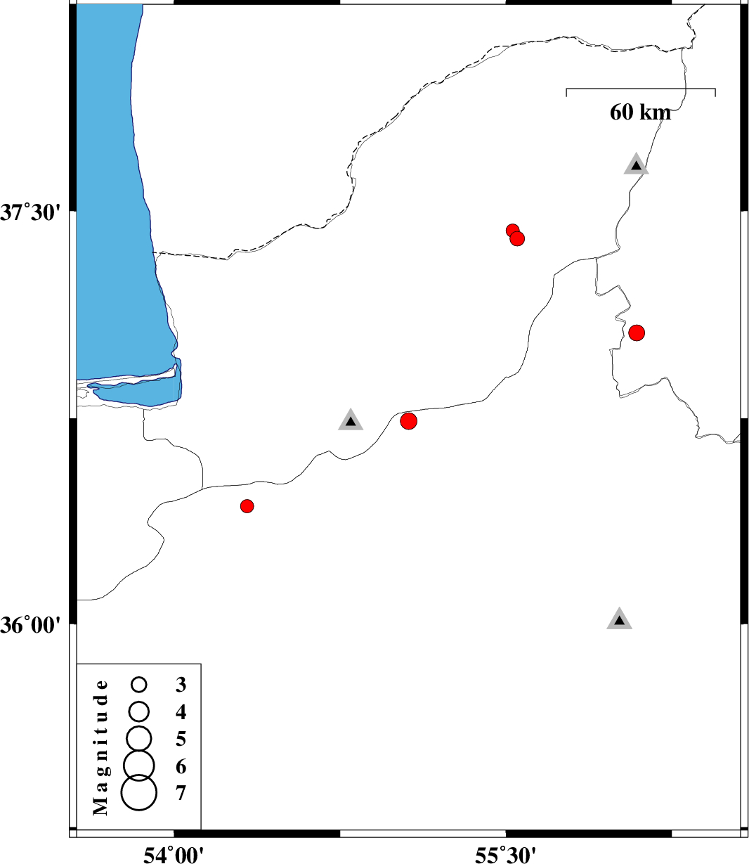 | 2010/08/24 | 07:07:01.0 | 11:37:01.0 | 36.74 | 55.06 | 15 | ML:3.4 | Semnan Province, 31 km South of Ramian | ||