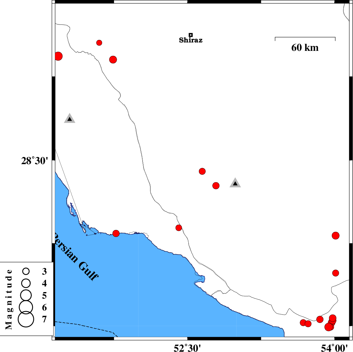 2010/08/07 | 00:00:54.2 | 04:30:54.2 | 29.4 | 51.74 | 42 | ML:3.4 | Fars Province, 26 km South of Kazerun | ||