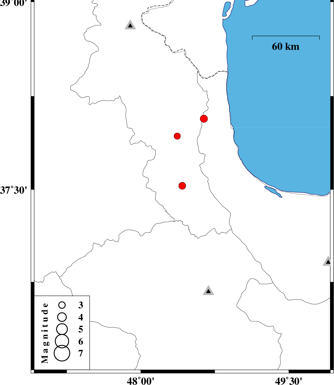 | 2010/08/24 | 04:11:00.1 | 08:41:00.1 | 37.93 | 48.37 | 14 | ML:3 | Ardebil Province, 26 km North of Givi | ||