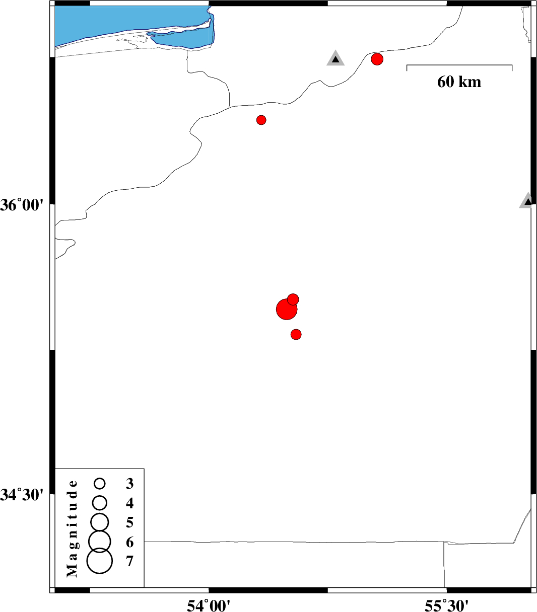 | 2010/08/27 | 20:11:08.1 | 00:41:08.1 | 35.51 | 54.53 | 15 | ML:3.3 | Semnan Province, 75 km South-East of Damghan | ||