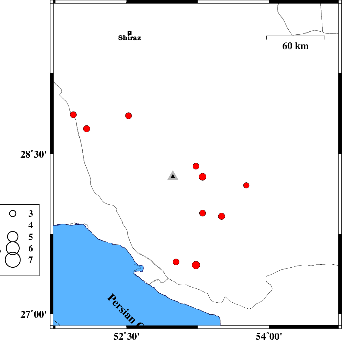 2010/08/07 | 00:00:54.2 | 04:30:54.2 | 29.4 | 51.74 | 42 | ML:3.4 | Fars Province, 26 km South of Kazerun | ||