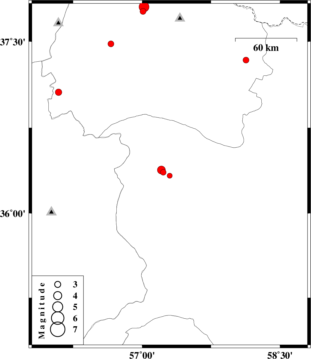 | 2010/08/09 | 11:57:32.5 | 16:27:32.5 | 37.34 | 58.13 | 35 | ML:3 | Khorasan(north) Province, 19 km East of Shirvan |