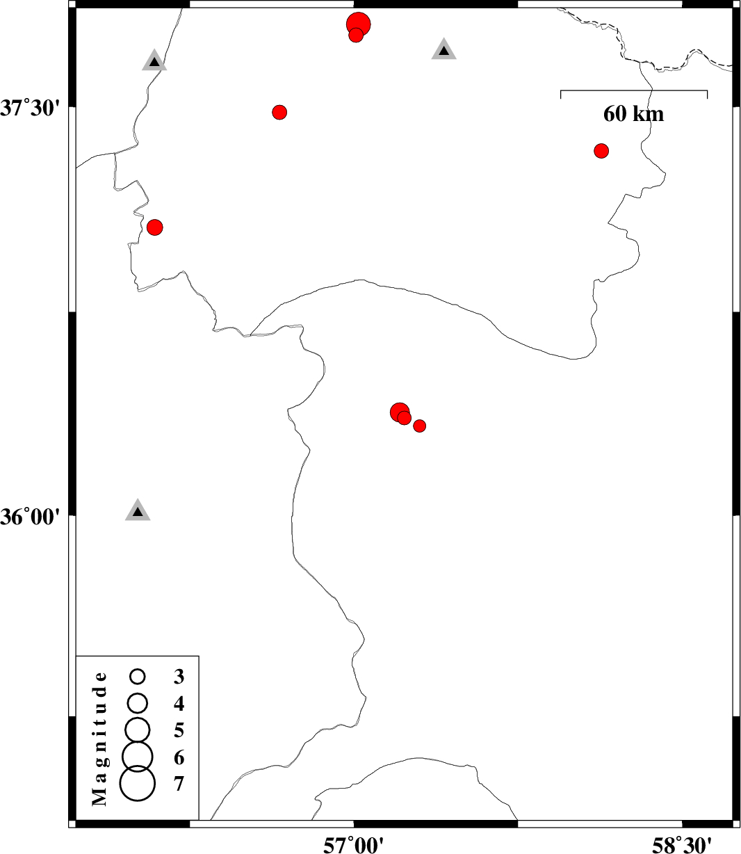 | 2010/08/09 | 11:57:32.5 | 16:27:32.5 | 37.34 | 58.13 | 35 | ML:3 | Khorasan(north) Province, 19 km East of Shirvan |