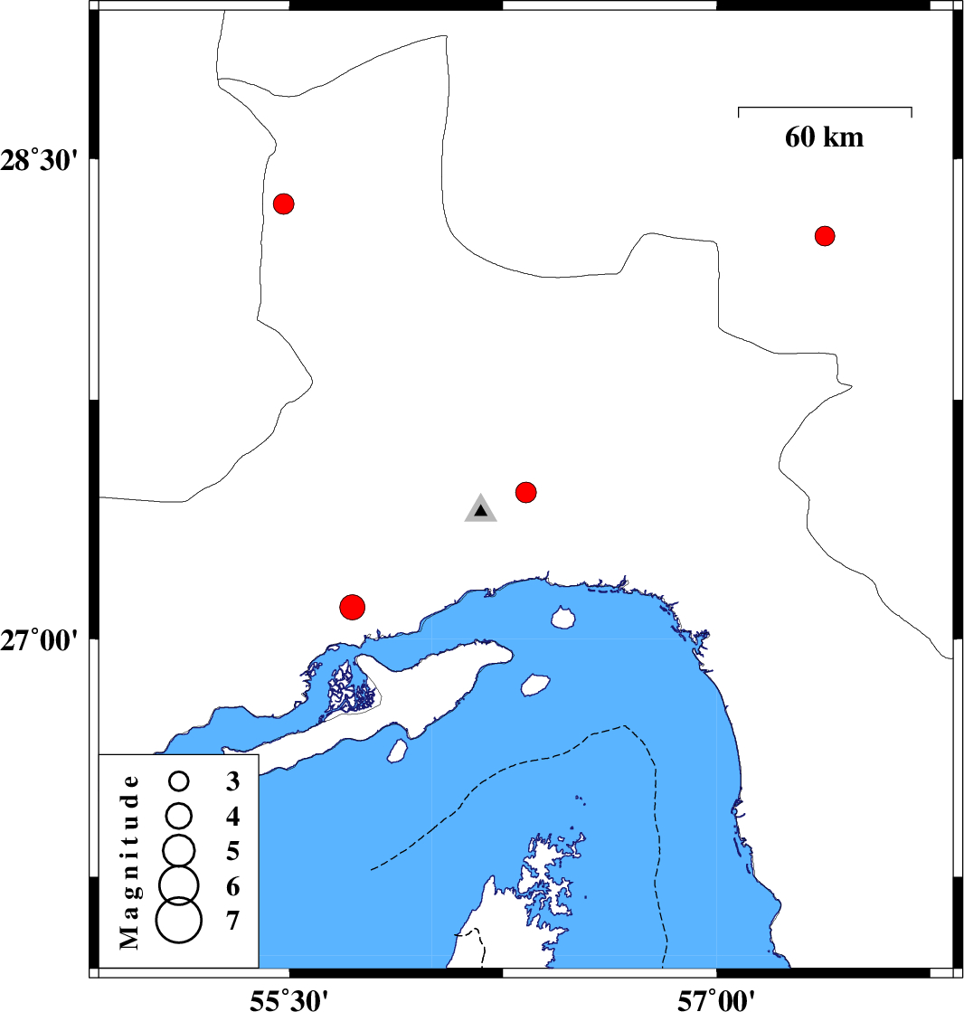 | 2010/08/11 | 09:06:45.6 | 13:36:45.6 | 27.1 | 55.72 | 10 | ML:3.9 | Hormozgan Province, 56 km West of Bandar-e abbas | ||
